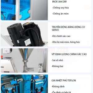 - Động cơ và hệ thống điều khiển: Điều khiển tốc độ quay của trục vít và thời gian hoạt động để định lượng chính xác sản phẩm. Hệ thống điều khiển PLC và màn hình cảm ứng giúp người vận hành cài đặt trọng lượng, tốc độ.